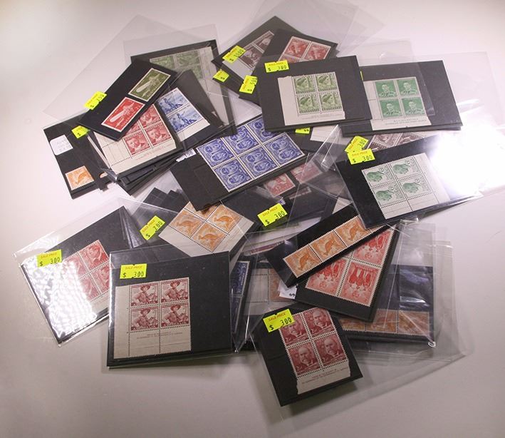 Australia, stamp collection, mainly MUH blocks of four, some cancelled, all ex dealers stock house in mini hagners, including some early cancelled Kangaroos; plus a few overseas issues, Canada, Gibraltar, New Guinea, Norfolk Island, a nice little collection with good resale potential (lot)