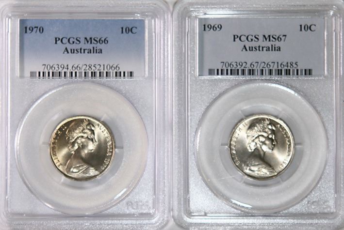 Australia, Ten Cents, 1969 PCGS MS67, 1970 PCGS MS66 (2 coins)