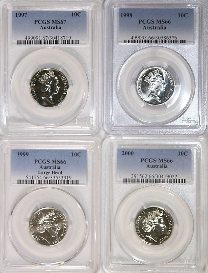 Australia, Ten Cents, 1997, 1998, 1999, 2000 PCGS MS66-MS67 (4 coins)