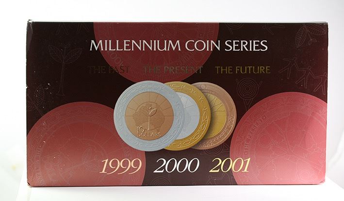 Proof Ten Dollars, Millennium Coin Series, The Past, The Present, The Future, set of 3 with matching certificate numbers, in series case as issued by RAM (3 coins)