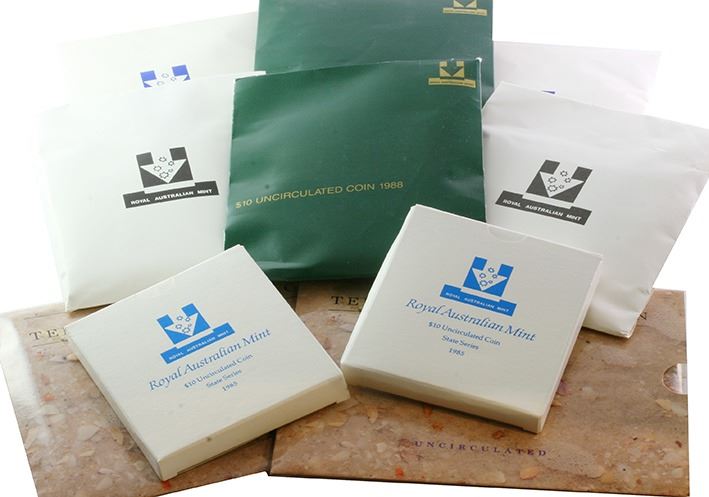 Uncirculated Ten Dollars, State Series 1985 VIC (2), 1986 SA (2), 1987 NSW (2) 1988 Biccent (2) 1989 QLD (2) (10 coins)