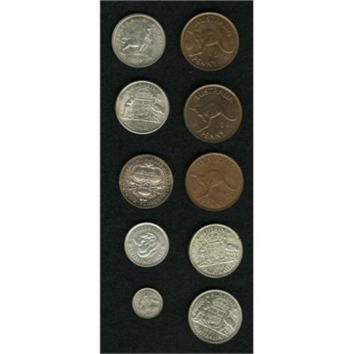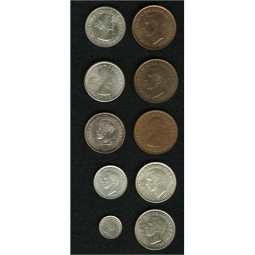 <B>Ten-piece lot as follows:</B></I> Penny 1948, KM36, UNC; Penny 1949, KM43, Red UNC; Penny 1953M, KM50, Threepence 1910, KM18, fully lustrous XF-AU but weakly struck; shilling 1939, KM39, lustrous XF; Canberra Florin 1927, KM31, UNC; Florin 1942S, KM40, Choice AU; Florin 1951, KM48, UNC with light abrasions; Florin 1953, KM54, UNC; and a Florin 1954, KM55, Choice AU. <BR><I>From the Robert Sayre Collection.</B></I><BR><BR><b>Shipping:</b> Coins & Currency (<a target="_blank" href="http://www.heritageauctions.com/common/shipping.php">view shipping information</a>)