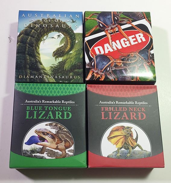 Australia, Perth Mint, proof silver One Dollar, 2015, Australian Age of Dinosaurs, Diamantinasaurus; together with Tuvalu, Perth Mint, proof silver One Dollar, Remarkable Reptiles, Frilled Neck Lizard 2013; Blue Tongue Lizard 2015; plus Tuvalu, proof One Dollar, Dangerous & Deadly series, Bull Ant, 2015, all in original packaging (4 coins)