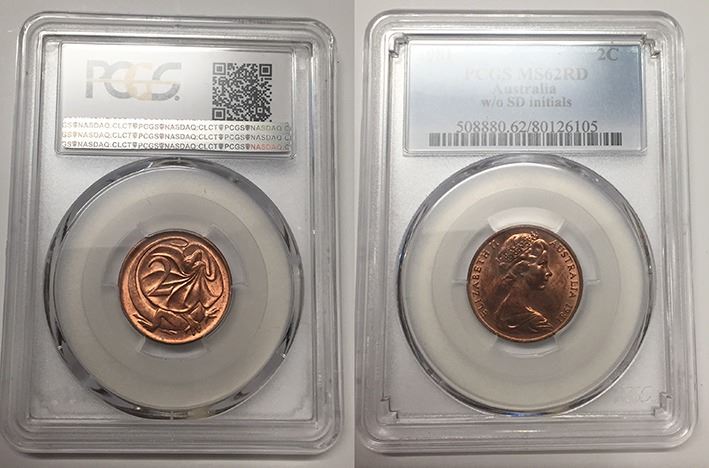 Two Cents, 1981, missing 'SD' Stuart Devlin designers initials, slabbed and graded PCGS MS62RD