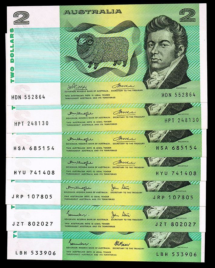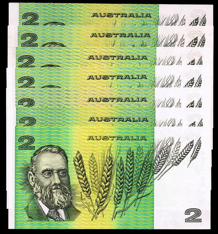 Phillips/Wheeler AUST (1974) (R.85); Knight/Wheeler gothic serials centre thread (1976) (R.86a), Knight/Wheeler OCR-B serials centre thread (1976) (R.86b), Knight/Wheeler OCR-B serials side thread (1976) (R.86c); Knight/Stone (1979) (R.87); Johnstone/Stone (1983) (R.88); Johnston/Fraser (1985) (R.89) all Uncirculated (7 notes)