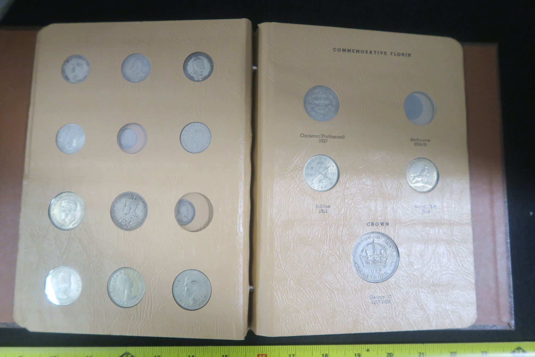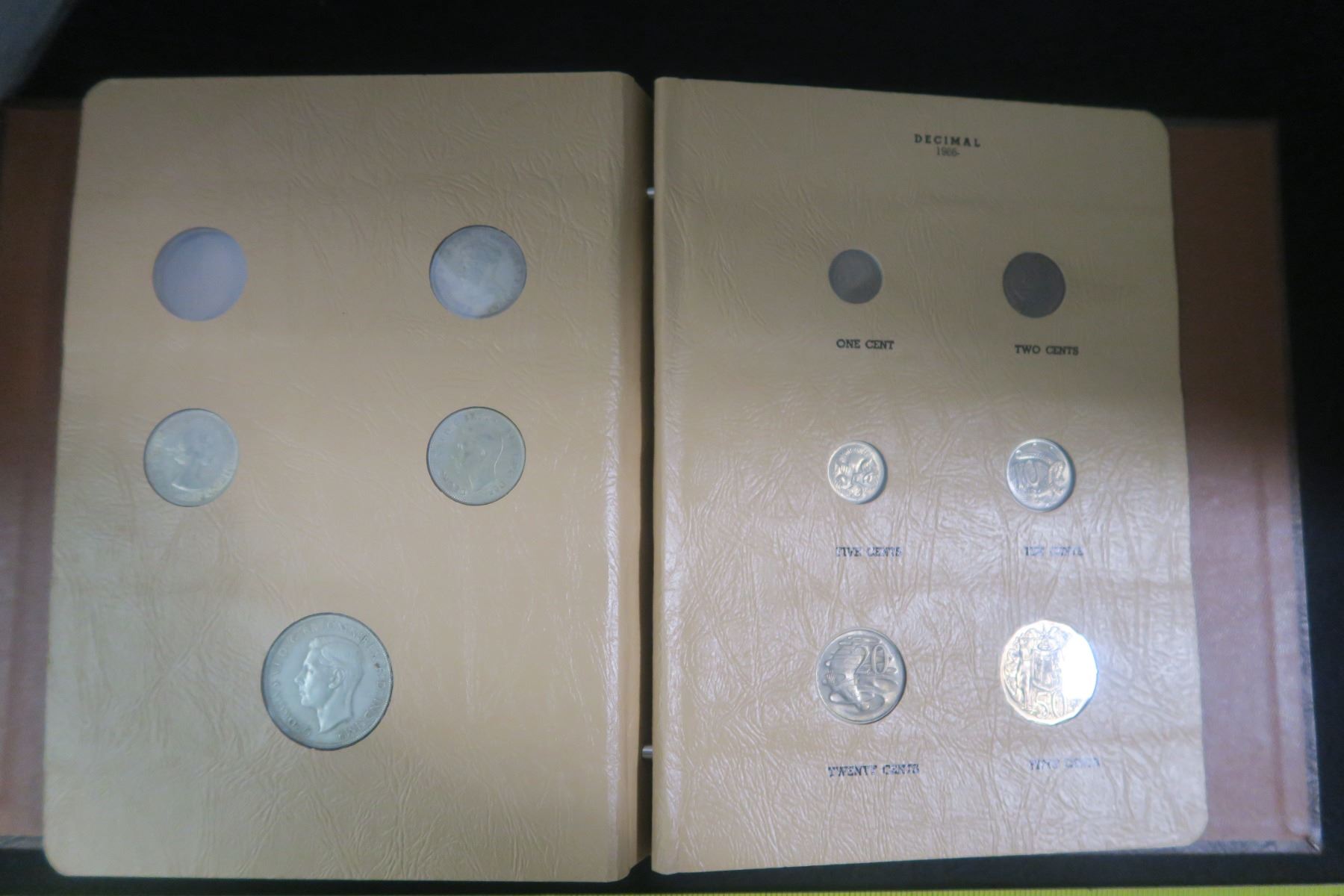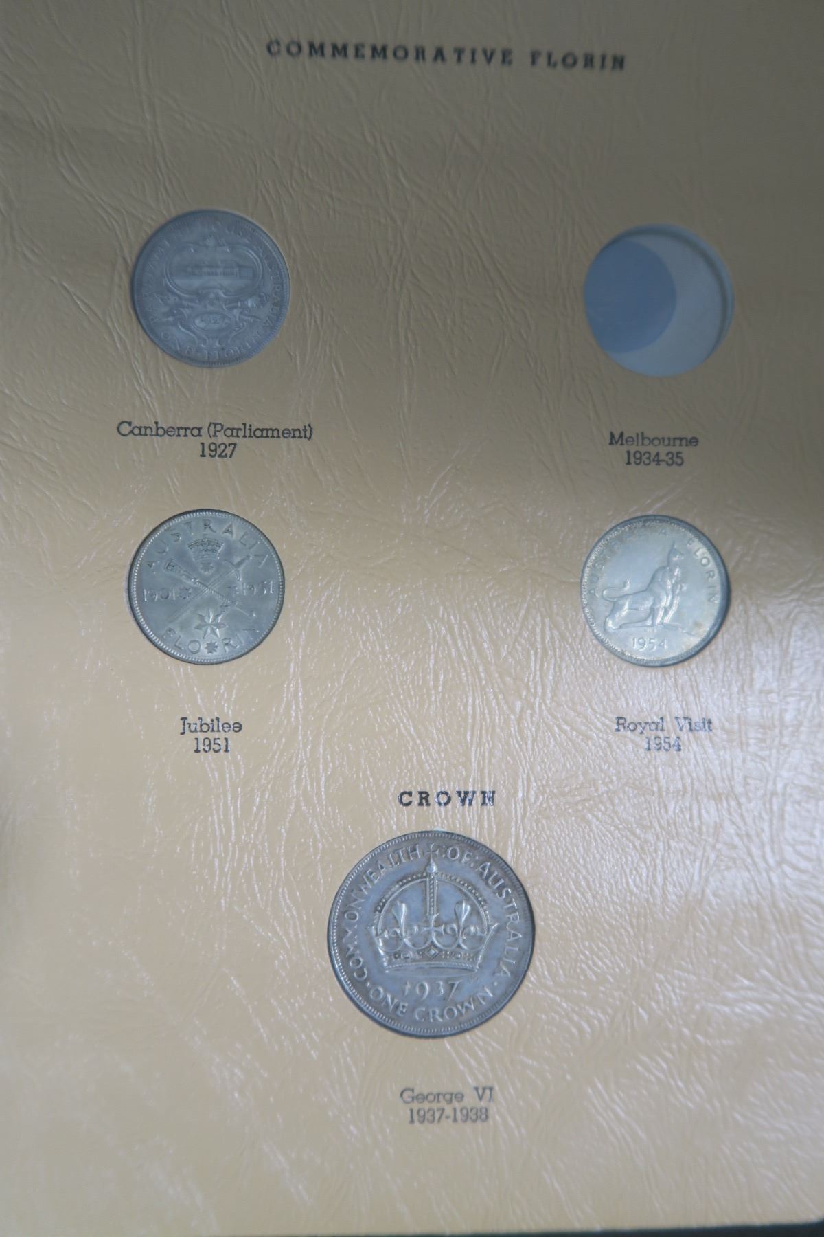 Australia Type Set Collection. 42 coins, includes half pennies, pennies, silver 3 pence, silver 6 pence, silver shillings, silver florins, 3 Commemorative silver florins, one silver 1937 crown, and 6 decimal coins. Missing only 3 silver coins. This is a nice set with 25 silver coins housed in a brown Dansco album. Coins grade VF to Unc.