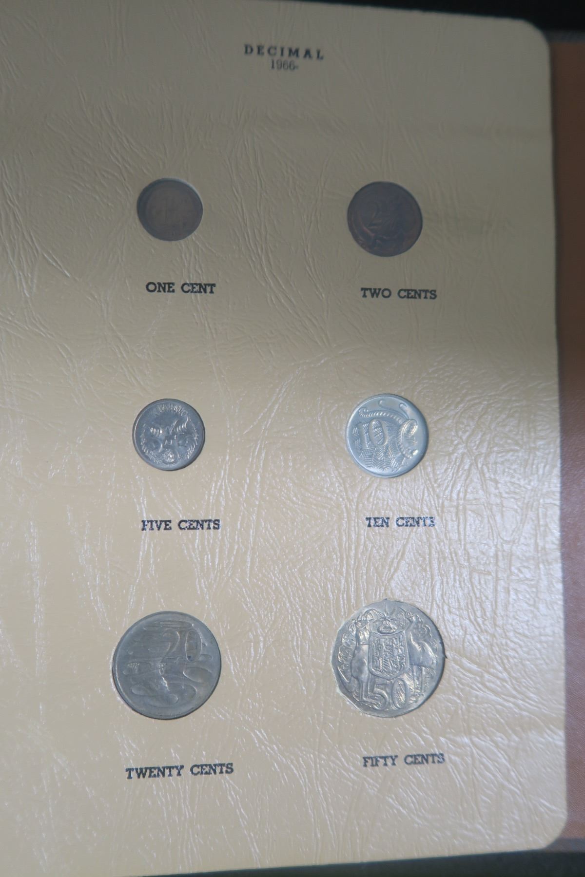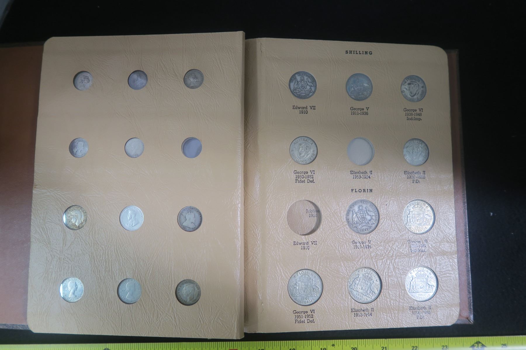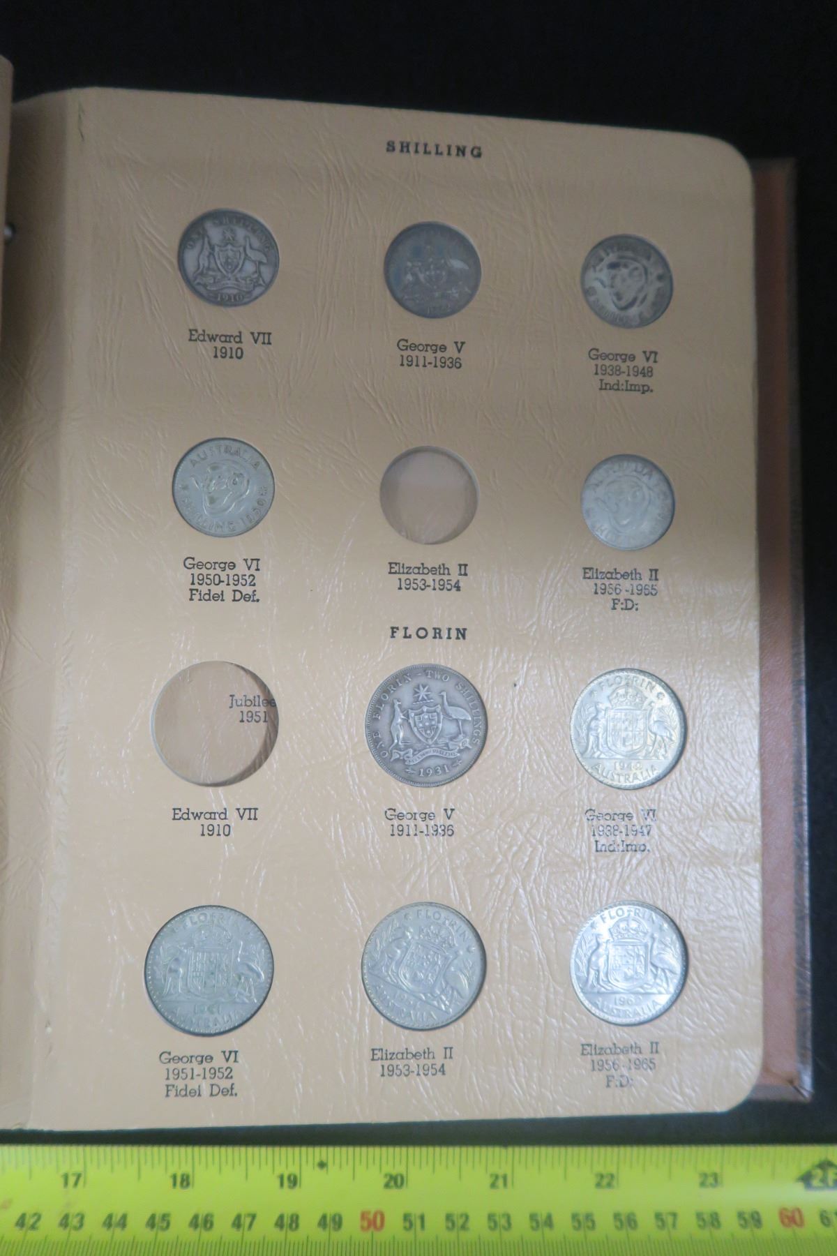 Australia Type Set Collection. 42 coins, includes half pennies, pennies, silver 3 pence, silver 6 pence, silver shillings, silver florins, 3 Commemorative silver florins, one silver 1937 crown, and 6 decimal coins. Missing only 3 silver coins. This is a nice set with 25 silver coins housed in a brown Dansco album. Coins grade VF to Unc.