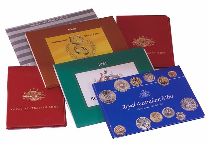 Uncirculated sets, 1981, 1983, 1984 (discolored), 1985, 1986, 1987, the first two plastic slightly sweaty (6 sets)