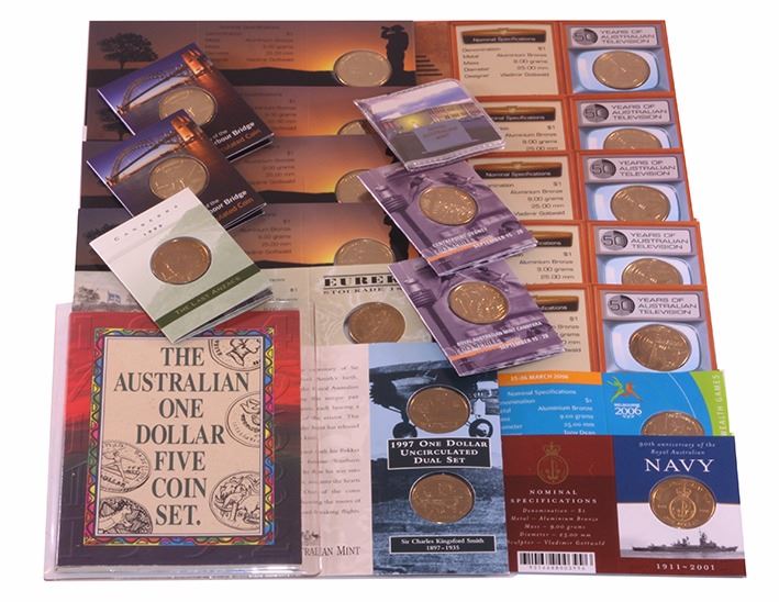Uncirculated One Dollar, 1984-92 5-coin set; together with Uncirculated One Dollar, 1991 Roo (private packaging) 1997 Kingsford Smith Pair; 1999 C; 2000 Olymphilex C, M; 2001 Navy; 2004 Eureka Stockade E; 2005 Gallipoli B, C, G, S, 2006 Television B, C, M, S; 2006 C'Wealth M; 2007 Harbour Bridge B, S (24 coins, 19 items)