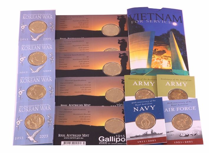 Uncirculated One Dollar, 2001 Army C, S; 2001 Navy, 2001 Air force; 2003 Korean War B, C, M, S; 2003 Vietnam pack; 2005 Gallipoli B, C, G, M, S, (14 coins)