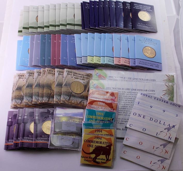Uncirculated One Dollar 1993 Landcare (2), C (2), M (2), S (1) BBC (2); 1994 Decade C (2), M (2), S (2); 1995 Waltzing Matilda B (2), C (2), M (2), S (2); 1996 Parks A (2), B (2), C (2), M (2), S (2); 1997 Kingsford-Smith A (2), B (2), C (2), M (2), S (2), 1998 Florey A (2), B (2), C (2), M (2), S (2); 1999 Last Anzacs A (2), B (2), C (2), M (2), S (2); 2000 Olymphilex C (2) S (2), all in original packaging (67)