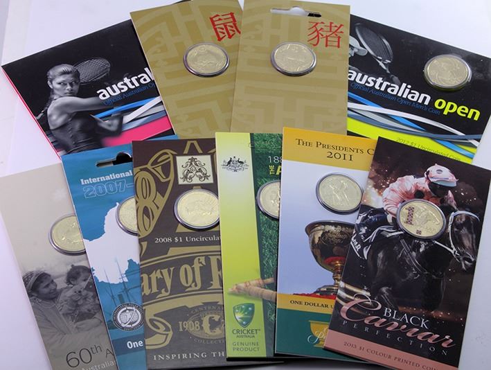 Uncirculated One Dollar 2007 Ashes, 2007 Peacekeeping, 2007 Year of the Pig, 2008 Rugby, 2008 Polar Year, 2008 Year of the Rat, 2011 Presidents Cup, 2012 Australian Open, Women & Men (2), 2013 Black Caviar (10)