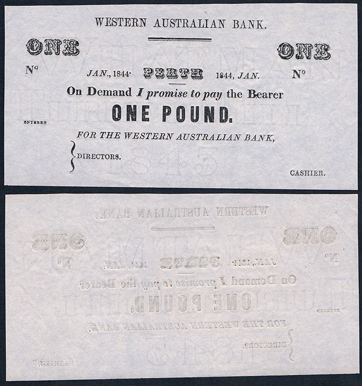 Australia, Western Australian Bank, Perth, 1844, unissued on watermarked paper, WHAT MAN, TURKEY HILL, 1843, graded as almost uncirculated