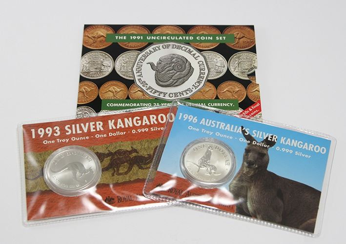 Uncirculated set, 1991; together with uncirculated 1oz Silver Kangaroo, 1993, 1996 (3 items)