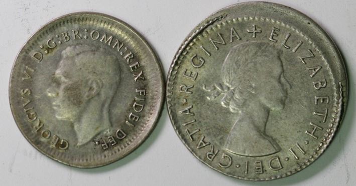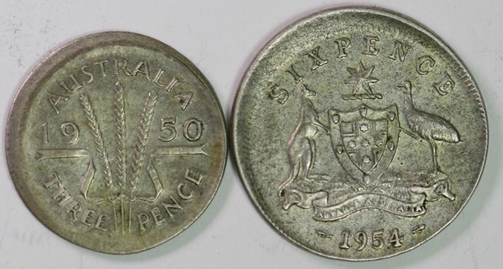 Threepence, 1950; Sixpence, 1954, both stuck off centre, toned, graded as good very fine (2 coins)