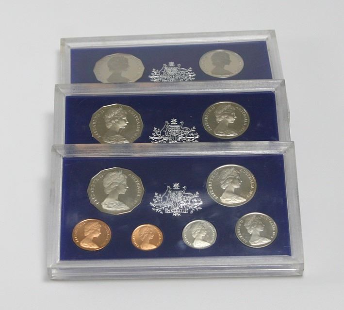Proof sets, 1972, 1973, 1974, missing outer foams and papers, light marks to plastics, the coins in perfect condition (3 coins)