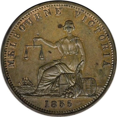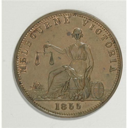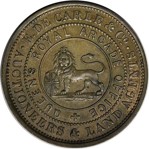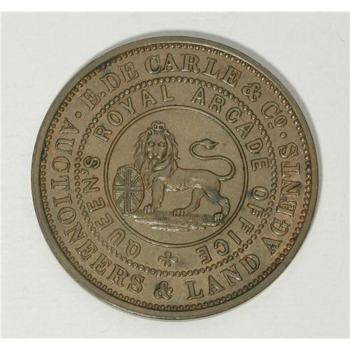 <B>Australian 19th Century Merchant Token.</B></I> A penny token issued in 1855 by E. De. Carle & Co., Melbourne, Victoria, KM Tn-55, AU50 with traces of original mint luster remaining around the lettering. The current catalog value is approximately $200-$300.<BR><BR><b>Shipping:</b> Coin/Currency (<a target="_blank" href="http://www.heritageauctions.com/common/shipping.php">view shipping information</a>)