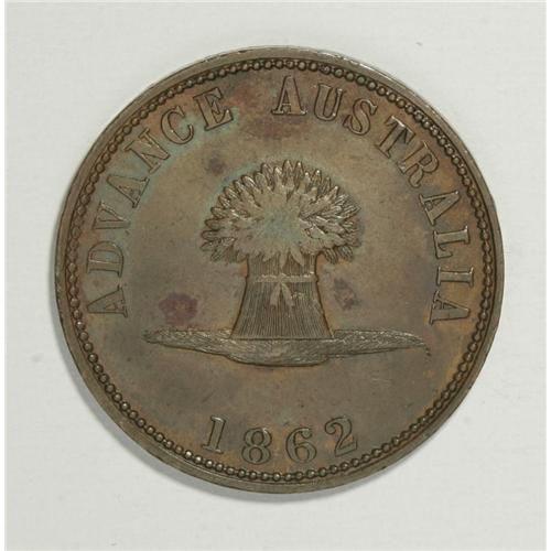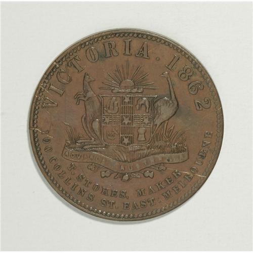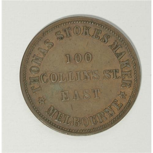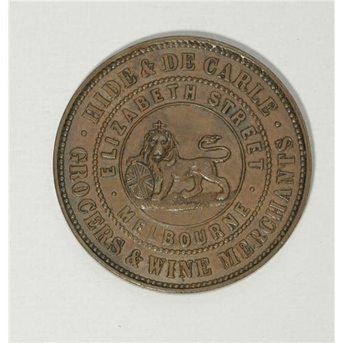 <B>Australian 19th Century Merchant Token Group Lot.</B></I> Consists of three one-penny tokens issued by these merchants: Thomas Stokes, Melbourne, Victoria, KM Tn-221, Very Fine; Hide & De Carle, Grocers, Melbourne, Victoria, KM Tn-104, Extremely Fine; and a Mule token, KM Tn-237, Very Fine to Extra Fine. Krause catalog value is approximately $250-$350.<BR><BR><b>Shipping:</b> Coin/Currency (<a target="_blank" href="http://www.heritageauctions.com/common/shipping.php">view shipping information</a>)