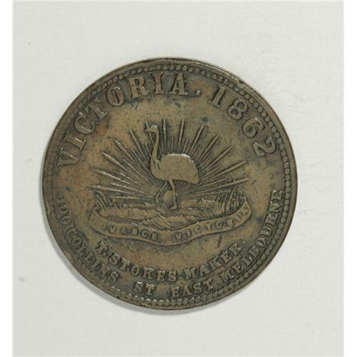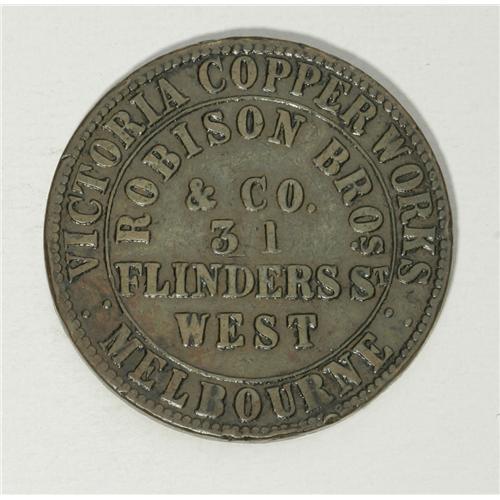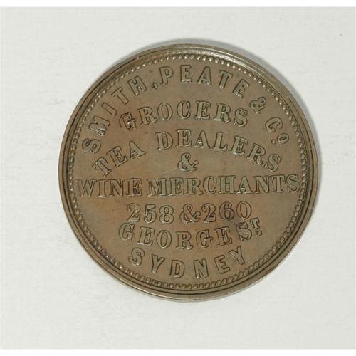 <B>Australian 19th Century Merchant Token Group Lot.</B></I> Consists of: a halfpenny issued by Smith, Peate & Co. Grocers, Sydney, NSW, KM Tn-210, Extra Fine; and an 1862-dated piece issued by Robinson Bros. & Co. Copper Works, Melbourne, Victoria, KM Tn-203. The value is roughly $250-$300.<BR><BR><b>Shipping:</b> Coin/Currency (<a target="_blank" href="http://www.heritageauctions.com/common/shipping.php">view shipping information</a>)