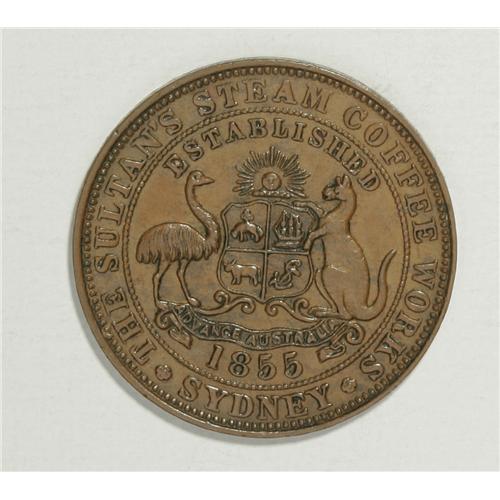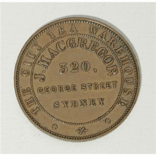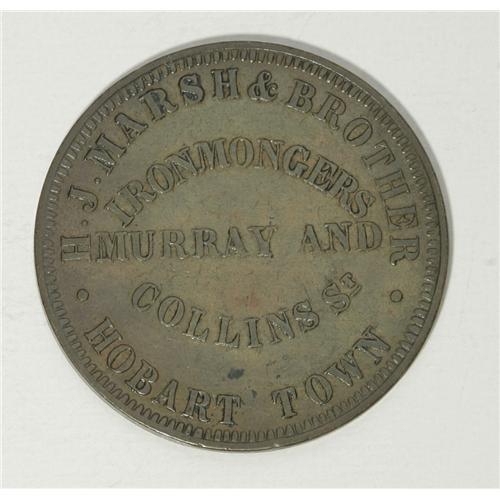 <B>Australian 19th Century Merchant Token Group Lot.</B></I> Includes a halfpenny from J. MacGregor, City Tea Warehouse, Sydney, NSW, dated 1855, KM Tn-152, XF; and a penny token issued by H.J. Marsh Brothers, Ironmongers Hobart Town, Tasmania, KM Tn-158.1, Fine. The catalog value is roughly $300-$400.<BR><BR><b>Shipping:</b> Coin/Currency (<a target="_blank" href="http://www.heritageauctions.com/common/shipping.php">view shipping information</a>)
