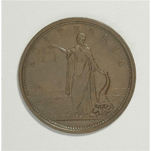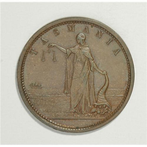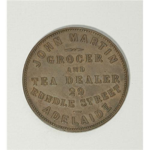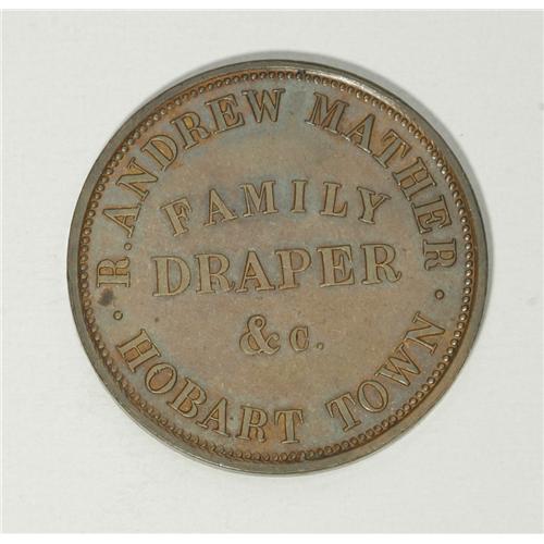 <B>Australian 19th Century Merchant Token Group Lot.</B></I> Includes two penny tokens: John Martin, Adelaide, South Australia, KM Tn-159, Very Fine; and R. Andrew Mather, Draper, Hobart Town, Tasmania, KM Tn-163, AU/Uncirculated. Catalog value is approximately $250-$350.<BR><BR><b>Shipping:</b> Coin/Currency (<a target="_blank" href="http://www.heritageauctions.com/common/shipping.php">view shipping information</a>)