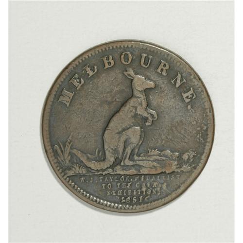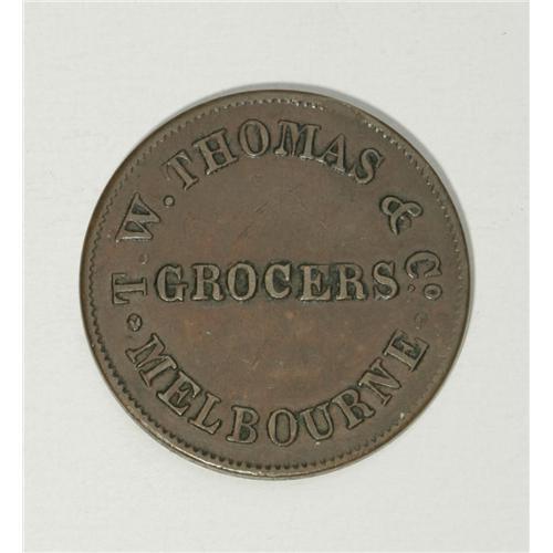 <B>Australian 19th Century Merchant Token Group Lot.</B></I> Includes a penny token issued in 1862 by T. Stokes, Melbourne, KM Tn-233, Extra Fine; halfpenny issued in 1851 by W.J. Taylor, Melbourne, Victoria, KM Tn-244, Fine; and a halfpenny issued in 1854 by T.W. Thomas & Son, Melbourne, KM Tn-248, Very Fine. The Krause catalog value is about $350-$450.<BR><BR><b>Shipping:</b> Coin/Currency (<a target="_blank" href="http://www.heritageauctions.com/common/shipping.php">view shipping information</a>)