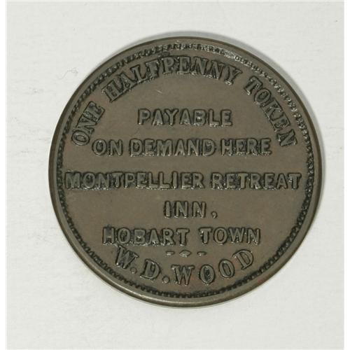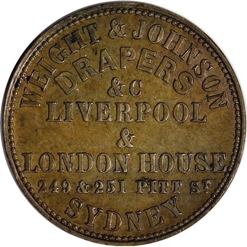 <B>Australian 19th Century Merchant Token Group Lot.</B></I> Includes two very scarce halfpenny tokens: Weight & Johnson, Sydney, NSW, KM Tn-267, Almost Uncirculated; and W.D. Wood, Hobart, Tasmania, KM Tn-273, Very Fine+. The Krause catalog value is approximately $300-$500.<BR><BR><b>Shipping:</b> Coin/Currency (<a target="_blank" href="http://www.heritageauctions.com/common/shipping.php">view shipping information</a>)