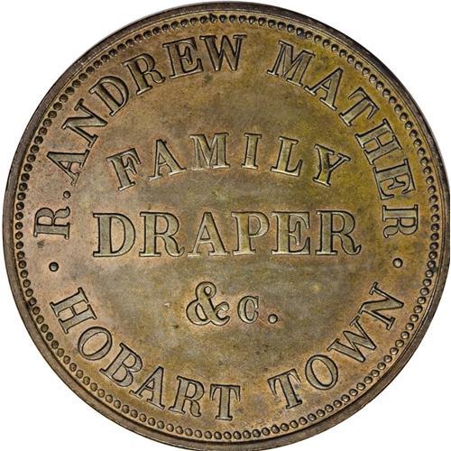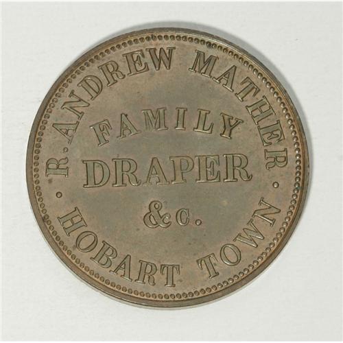 <B>Australian 19th Century Merchant Token Group Lot.</B></I> Includes two penny merchant tokens: Andrew Mather, Hobart, Tasmania, Brown Uncirculated, KM Tn-163; and Merry and Bush, Queenstown, KM Tn-165, Fine. Catalog value $200-$300.<BR><BR><b>Shipping:</b> Coin/Currency (<a target="_blank" href="http://www.heritageauctions.com/common/shipping.php">view shipping information</a>)