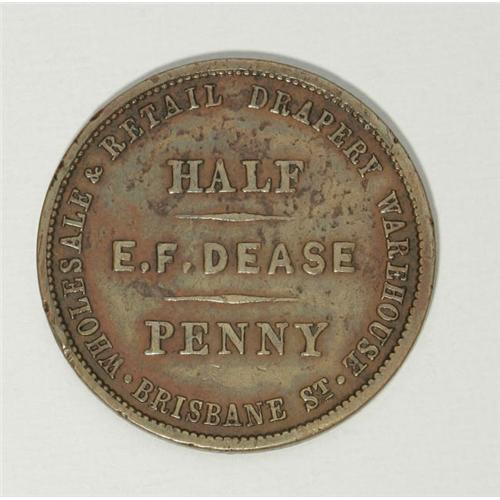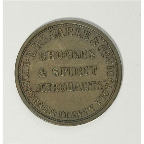 <B>Australian 19th Century Merchants Token Group Lot.</B></I> Two tokens, one issued by E.F. Dease of Launceston, Tasmania, KM Tn-50, Fine; and one issued by Edwd. De Carle & Co. of Melbourne, Victoria, KM Tn-54, Very Fine or better. The Krause catalog value is about $285-$385.<BR><BR><b>Shipping:</b> Coin/Currency (<a target="_blank" href="http://www.heritageauctions.com/common/shipping.php">view shipping information</a>)