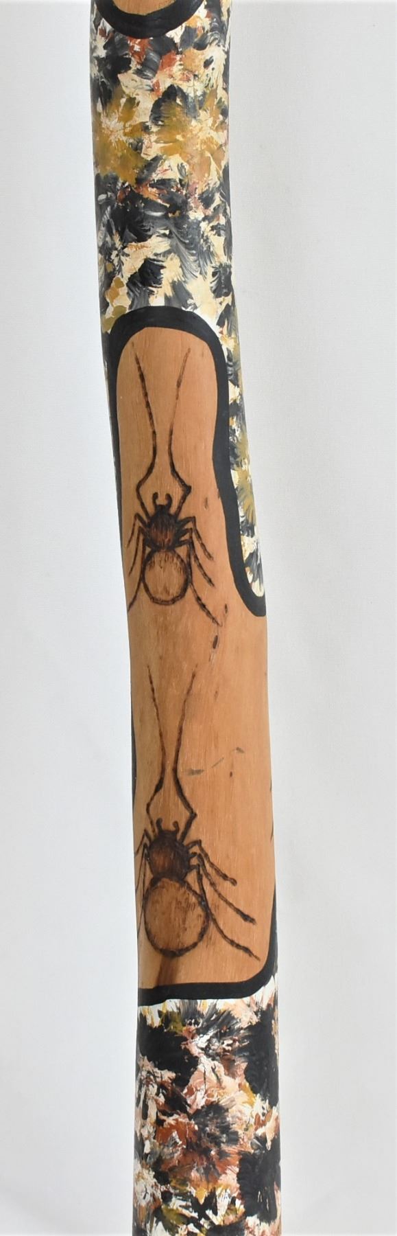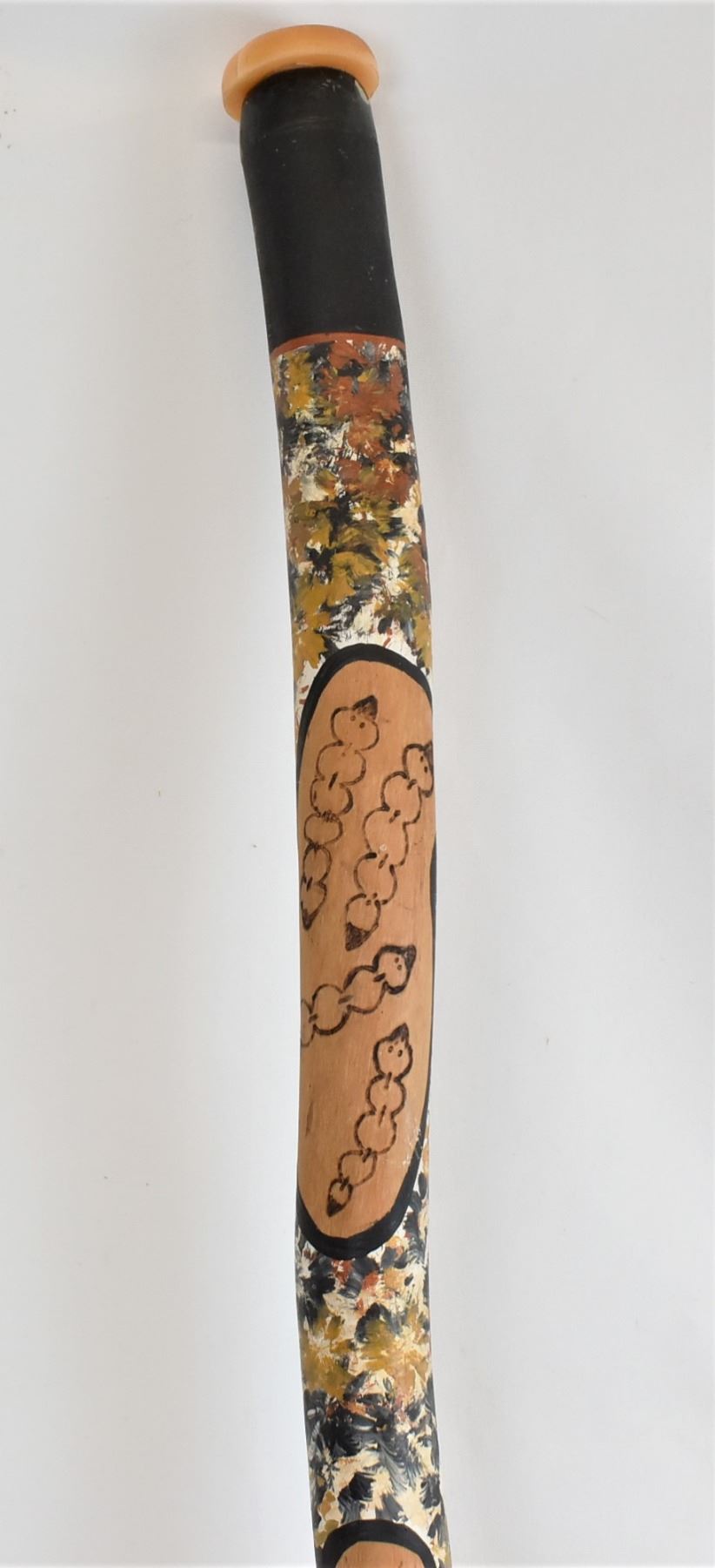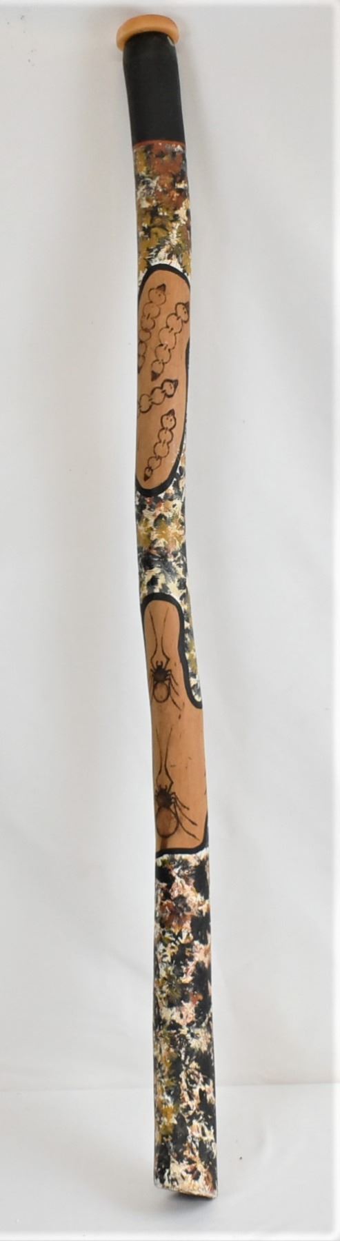 Australian Aborigine Wood Didgeradoo, measures 41''L x 2.25''D, mouthpiece is made of beeswax and the wax has a couple of cracks in it, hand painted and wood burned, termite and larvae motif, FYI: ''A didgeridoo is a eucalyptus trunk naturally hollowed out by termites. However, several stages separate the trunk in its natural state from the finished instrument.''