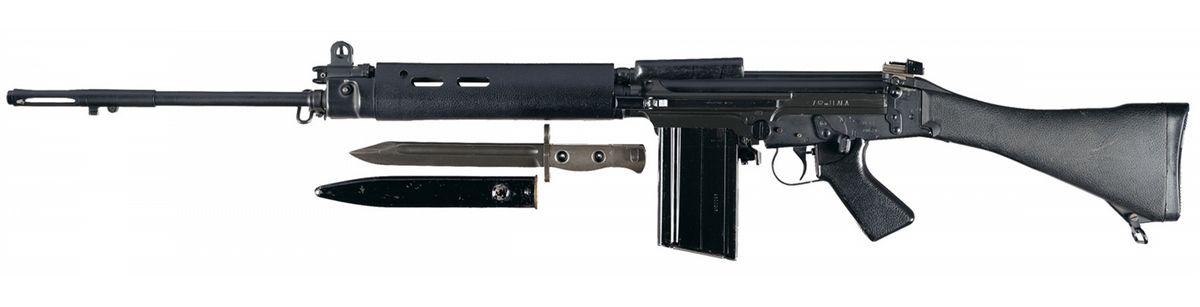 S.A.F. receiver, imported by Eden International and assembled with a British L1A1 part set. Adjustable guarded front blade and adjustable flip up rear peep sight. Long flash hider with bayonet lug and the standard carrying handle. Adjustable gas port. Marked "7-62 mm. LI.AI.A/UE 63/A116710" on the left side of the receiver and "EDEN INTL/PALM BAY, FL S.A.F. 860632/AUSTRALIA" on the right side. Fitted with black textured synthetic buttstock, pistol grip and vented handguard. Complete with bayonet and scabbard.