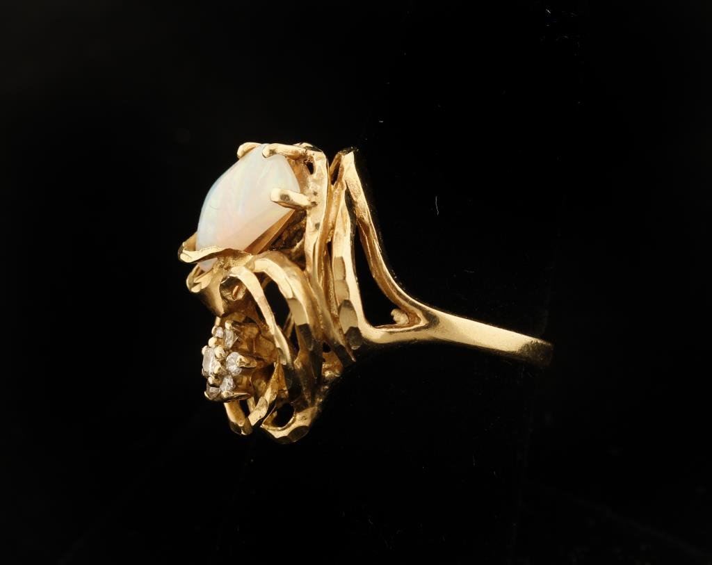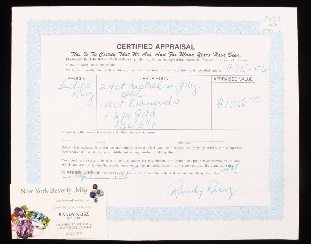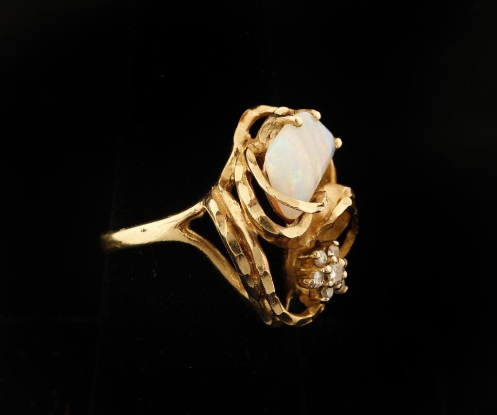 Australian Jelly Opal approx 2.4 carats with accenting Diamonds in 14K yellow gold. size 6 1/4. Est:$500-1,000