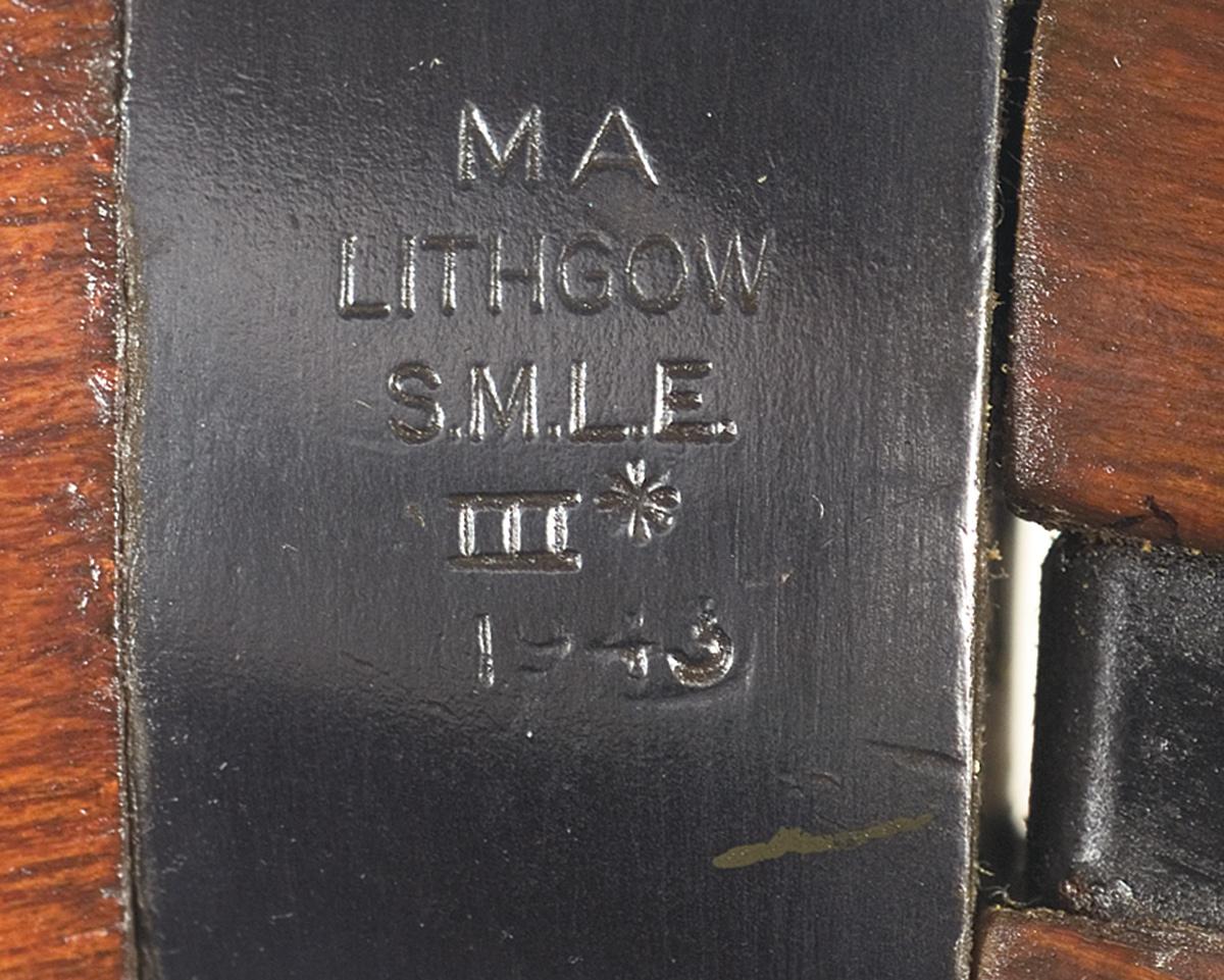Australian Lithgow No. 1 MKIII* SMLE rifle manufactured in 1943 and fitted with a Pattern 1918 (AUST), low mount, telescopic sight. The rifle and telescopic sight have a blued finish; the bolt is bright. The rifle has a coach wood buttstock, forearm and handguard; the buttstock has a brass buttplate. The telescopic sight has the distinctive claw mount similar to that used on the British Model Pattern 14, No. 3 MKI (T) Sniper Rifles. The three-power, Australian Pattern 1918 Telescopic Sight has a post and cross-wire reticule. Lithgow manufactured 1,612 No. 1 MKIII* H.T. Sniper Rifles between November 1944 and February 1946. Only 481 of these rifle has the 'low mount' fitted originally and untold numbers retro fitted as this example. The No. 1 MKIII* H.T. Sniper Rifles saw extensive service in the Solomon Islands and Borneo during the closing months of WWII and were used by Australian forces in the Korean Conflict. The rifles remained in Australian service until the 1970s. The right side of the butt-socket is roll-stamped: "MA / LITHGOW / S.M.L.E. / III* / 1943" in five lines. The serial number, "E78095" is stamped on the rear face of the bolt handle, on the right side of the breech, on the underside of the rear sight, on the top of the bayonet lug and on the bottom of the forearm. All of the rifle serial numbers match. The right side of the telescopic sight tube is roll-stamped: "SIGHT TELESCOPIC / PATT. 1918 (AUST.) 1 / B.A.A 3650 G.A. / AO.C./V". The left side of the scope tube is roll-stamped with the Australian Army property mark and date of manufacture: "D ^ D 1945". "E65178" is electro-penciled on the bottom of the scope tube. Both of the receiver scope mounts and the front ring are numbered "1958". The rifle and telescopic sight serial number are not on the list of No. 1 MK III* serial numbers on pages 327-324 of "THE LEE-ENFIELD STORY" by Ian Skennerton. Most of the Australian SMLE sniper rifles were built on 1916 or 1917 production Lithgow SMLE receivers. Original production rifles had the rifle serial number expertly engraved on the scope tube. The SMLE snipers were fitted with heavy, target barrels and had "H" stamped on the top of the butt-stock wrist and a wooden plug fitted in the screw hole behind the barrel band; this rifle lacks the plug and "H" mark and appears to have a standard barrel. The forearms and bayonet lugs of sniper configuration Lithgow SMLE rifles were not stamped with the rifle serial number. The rifle is complete with a scarce Australian canvas covered Micarta scope can for the Pattern 1918 (AUST) telescopic sight and a "1941" marked canvas sling.