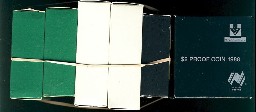 Australian Mint Lot; Includes 1988 Proof Coins $2 KM#101a, $5 KM#102 & $10 KM#103. 2 of each example all in original cases and boxes. 6 coins.