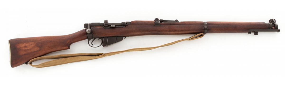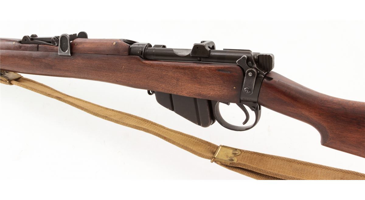 Australian No. 1 MK III Bolt Action Rifle, by Lithgow (1922), #B4335, .303 cal., 25'' barrel, phosphate finish, dark stained birch stock, with sling. Condition is very good, as probably overhauled at one point. Rifle retains approx. 95% phosphate finish. Stock with just the lightest marks from handling. Crisp action, fine bore. Lightly import marked. Est.: $400-$600. (C&R)
