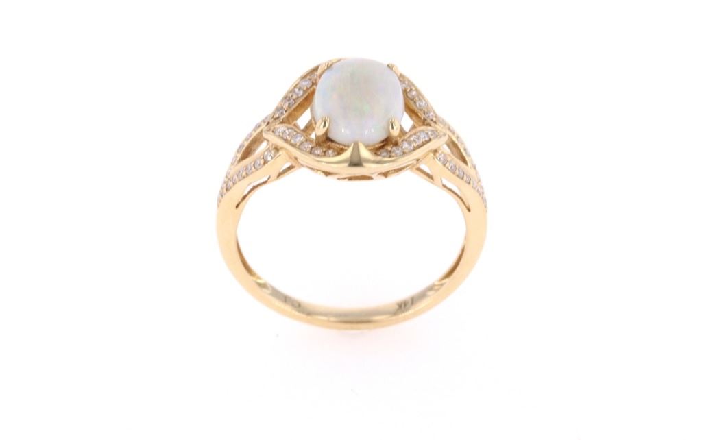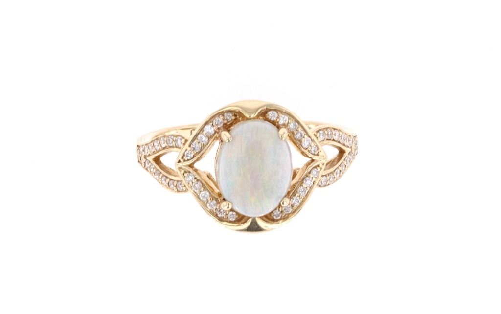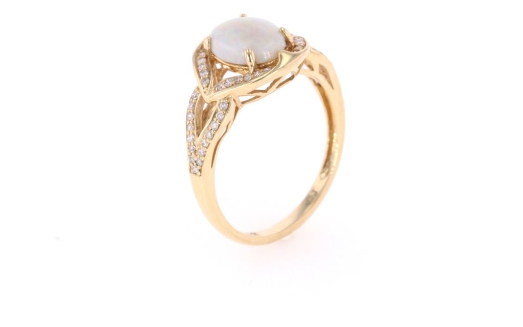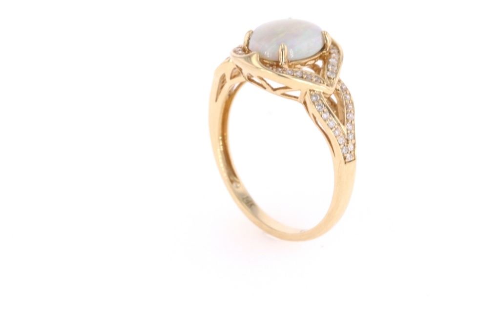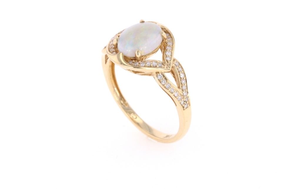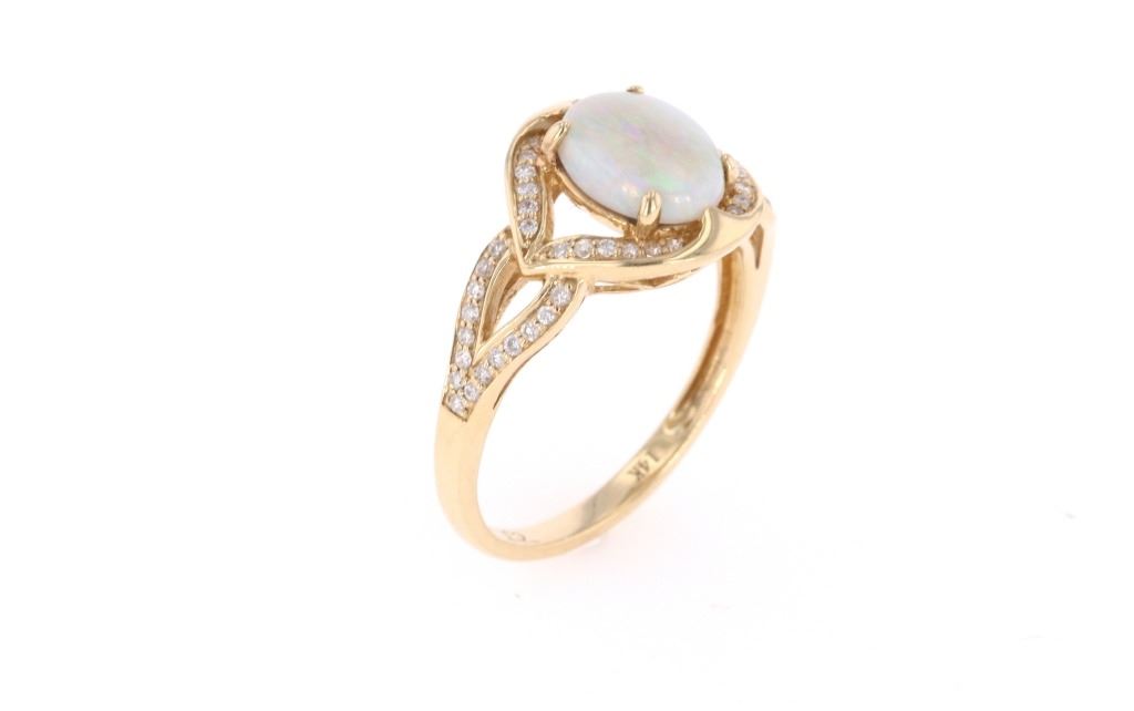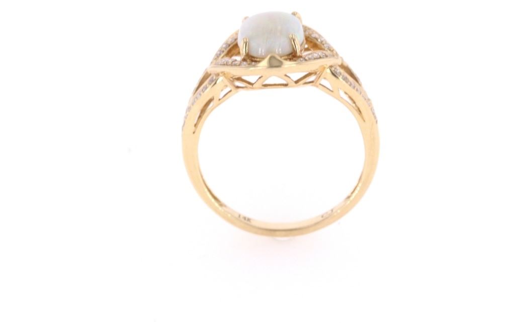 Featured in this lot is this Australian opal and diamond, 14k yellow gold ring. The ring shows a professionally crafted art deco style decoration constructed from 14k yellow gold with a gold weight of 3.10 GM. The center stone shows an oval cut Australian opal cabochon weighing 1.06 carats. The art deco border decoration is profusely embellished with a total of 54 round brilliant cut diamonds weighing 0.20 carats. The ring shows the Color Jewel Inc. hallmark with a 14k gold stamp on the inside of the ring band. The ring size is US 7 1/4.