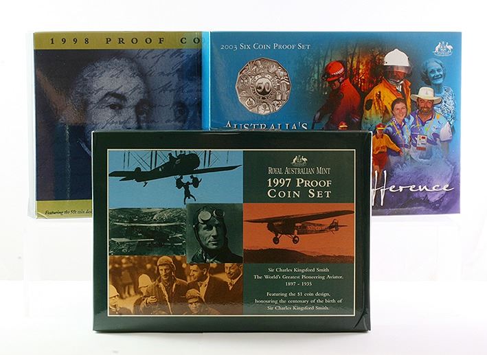 Proof Sets 1997, 1998, 2003 (3 sets), the first with creased outer packaging.