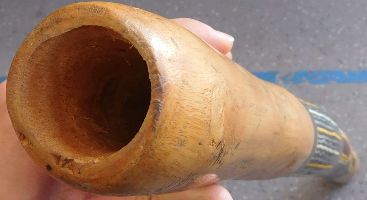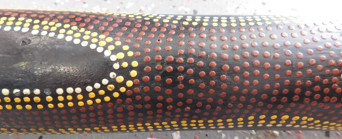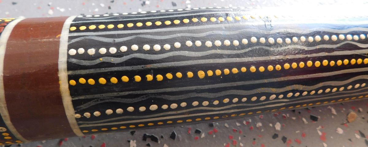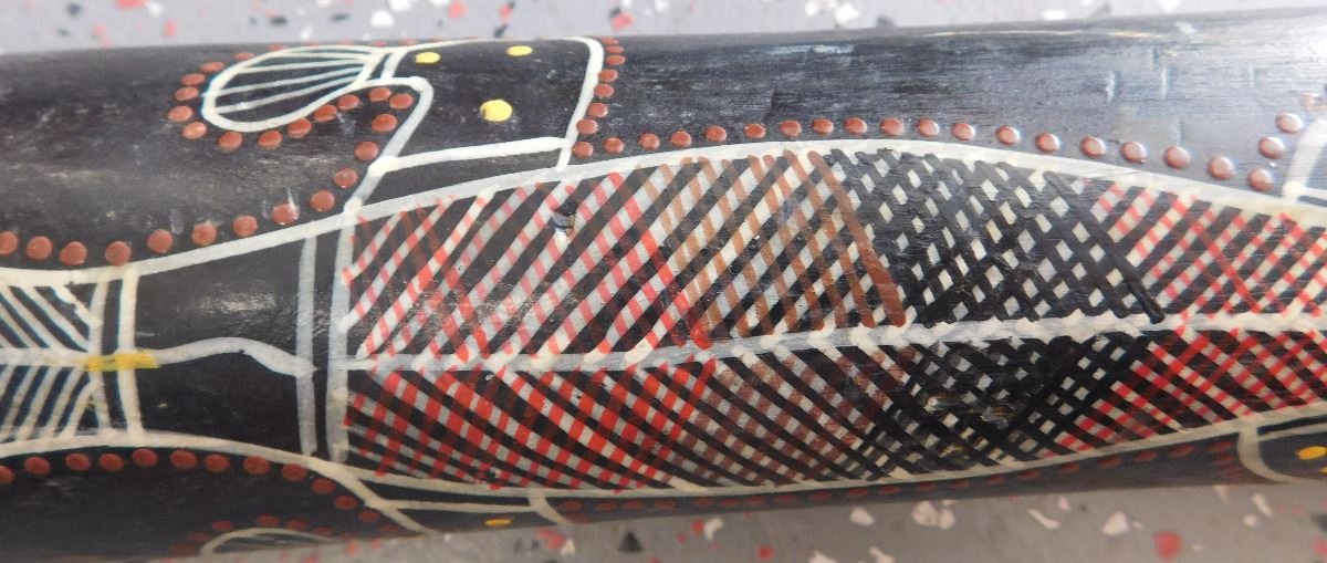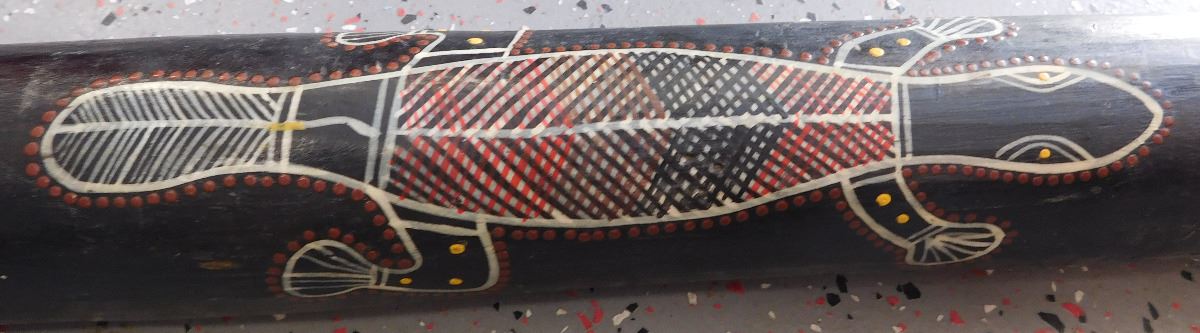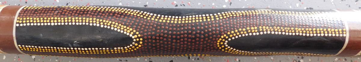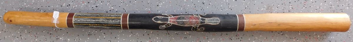 Australian Reptile Effigy Didgeridoo, circa 1960s. Made of wood and paint, the item measures 49" x 4.5" x 4". From Australia. Fine paintwork, has a nice sound. Condition: Minor paint loss, see images. Shipping: 60.00 w/insurance and signature, USA estimate only.