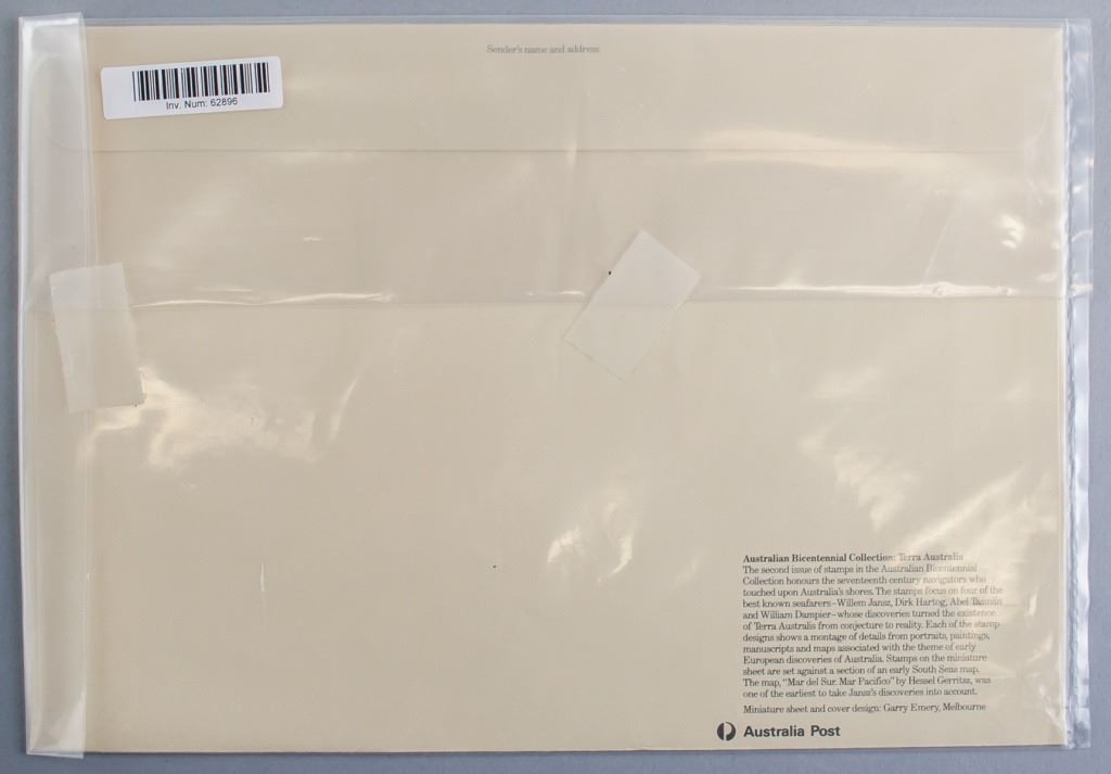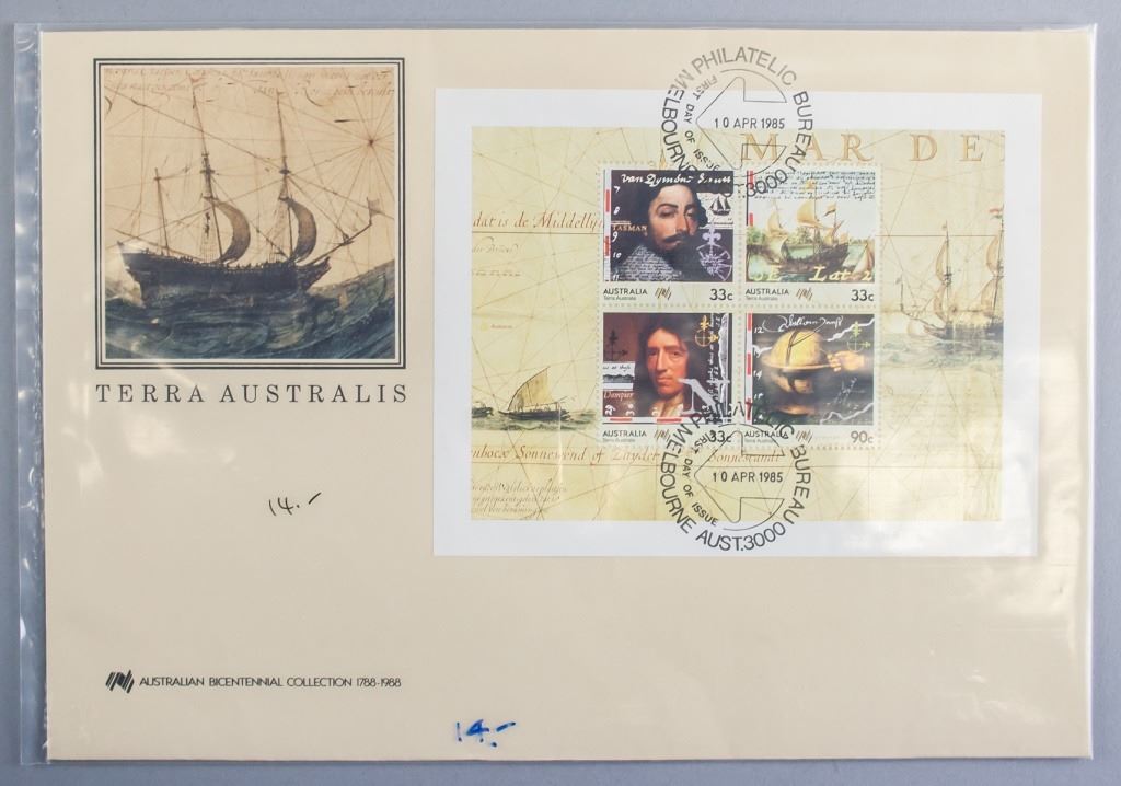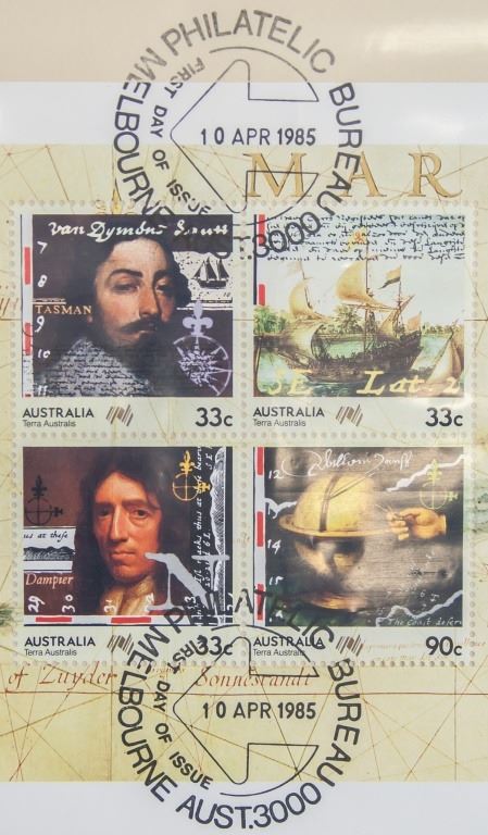 Set of Australian stamps. Issued 1985. Honoring the seventeenth century navigators who reached Australia - Willem Jansz, Dirk Hartog, Abel Tasman, and William Dampier. 19 x 27 cm.