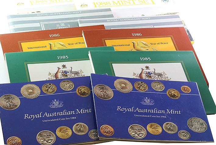 Uncirculated Sets 1984 (2), 1985 (2), 1986 (2) 1987 (2), 1988 (2) (10 sets), the 1984's discoloured