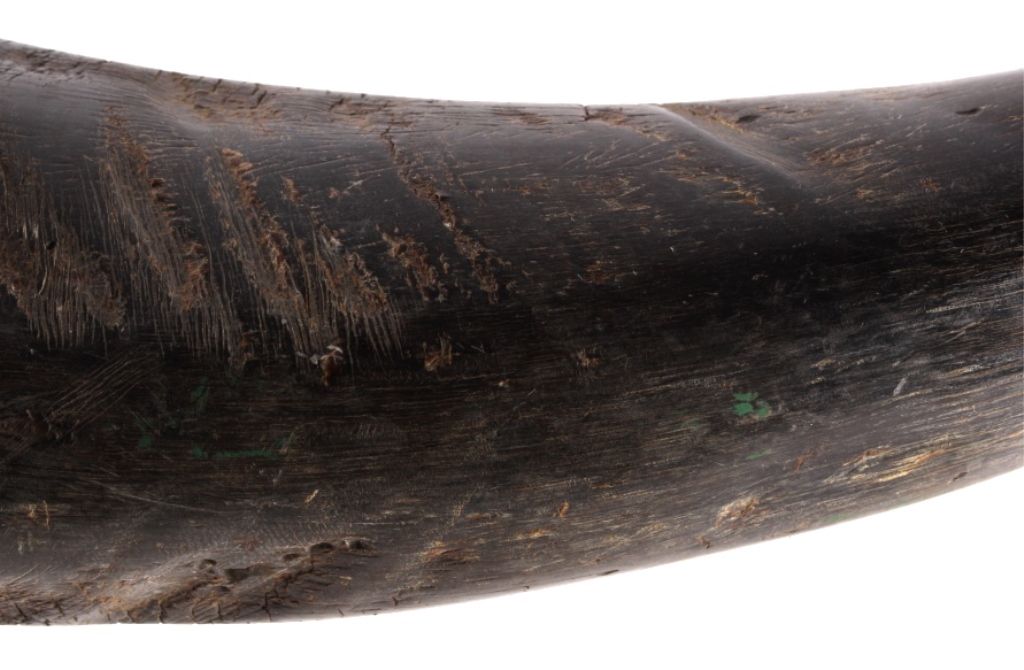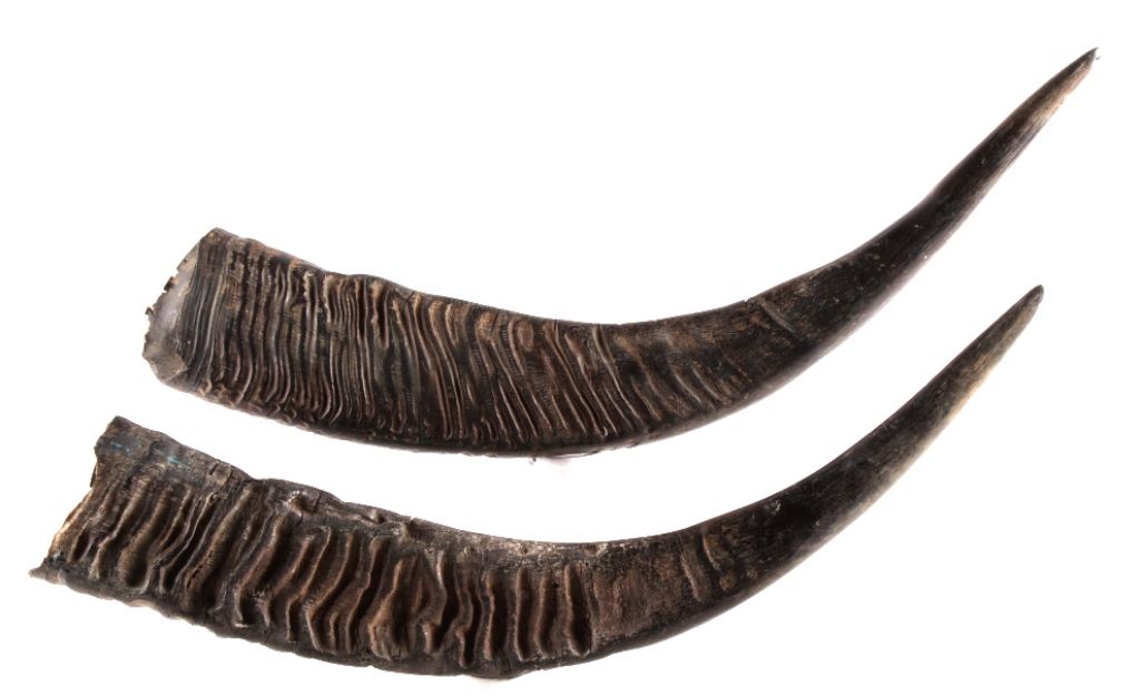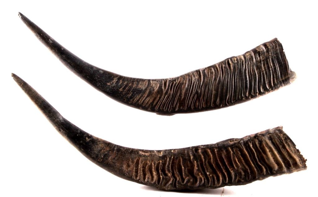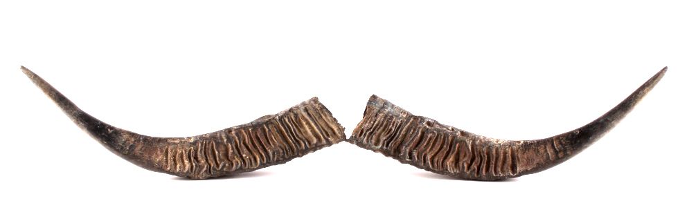 This is a set of original Australian Water  Buffalo Horns. The horns show a large size  and good condition. Each horn measures 26"  across, 29.75" along the outside, and 4.5"x3"  thick.
