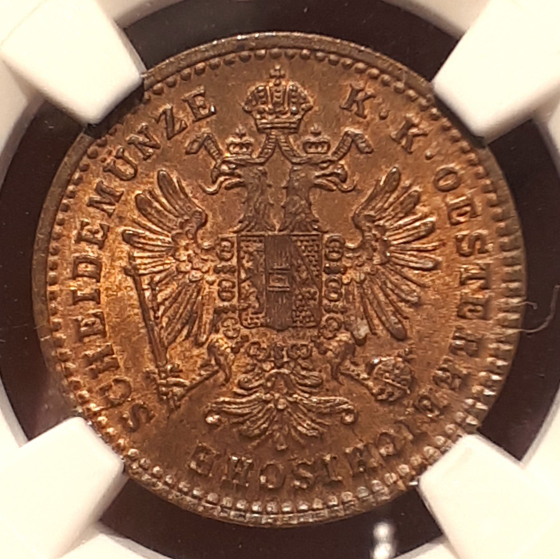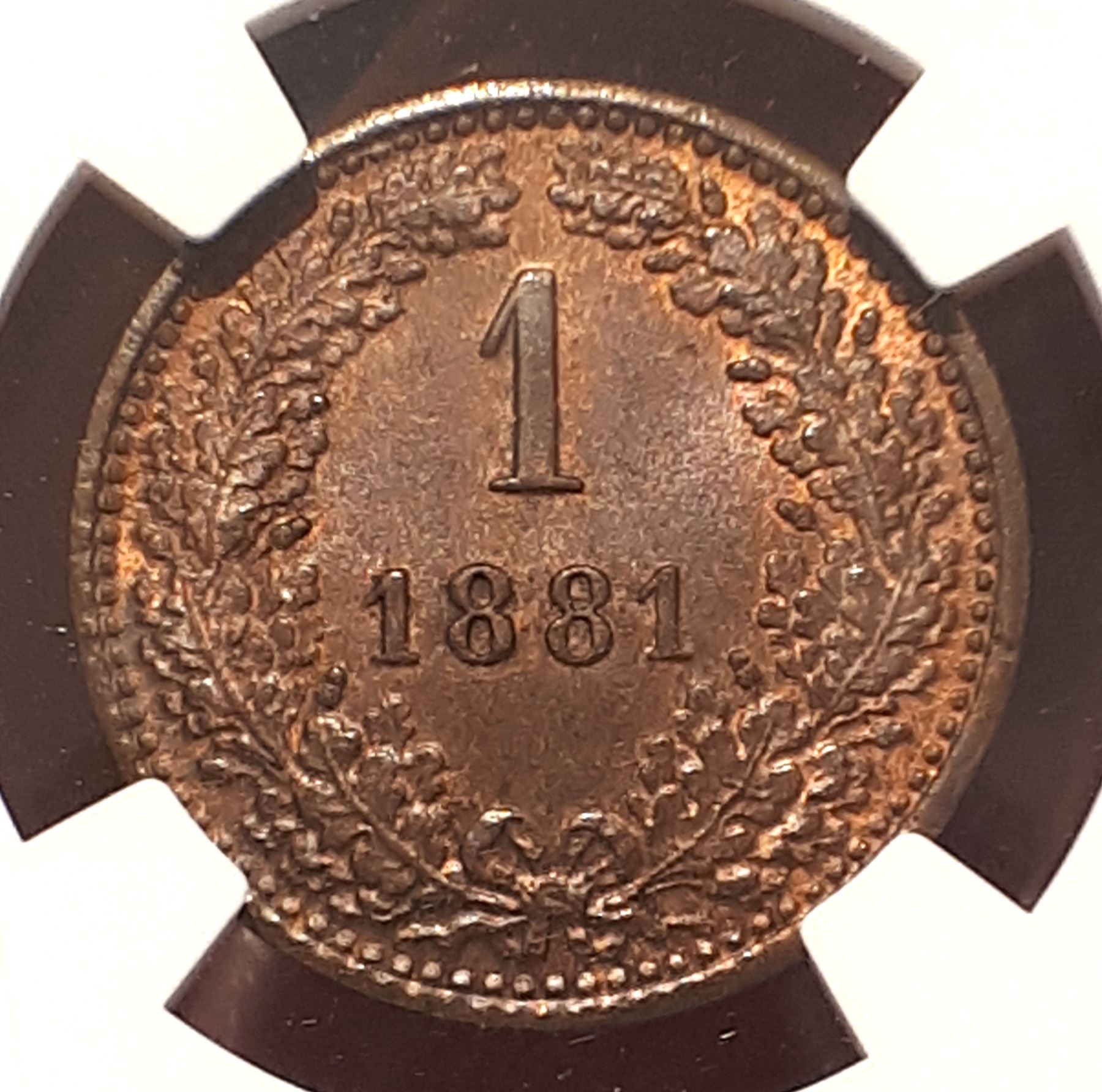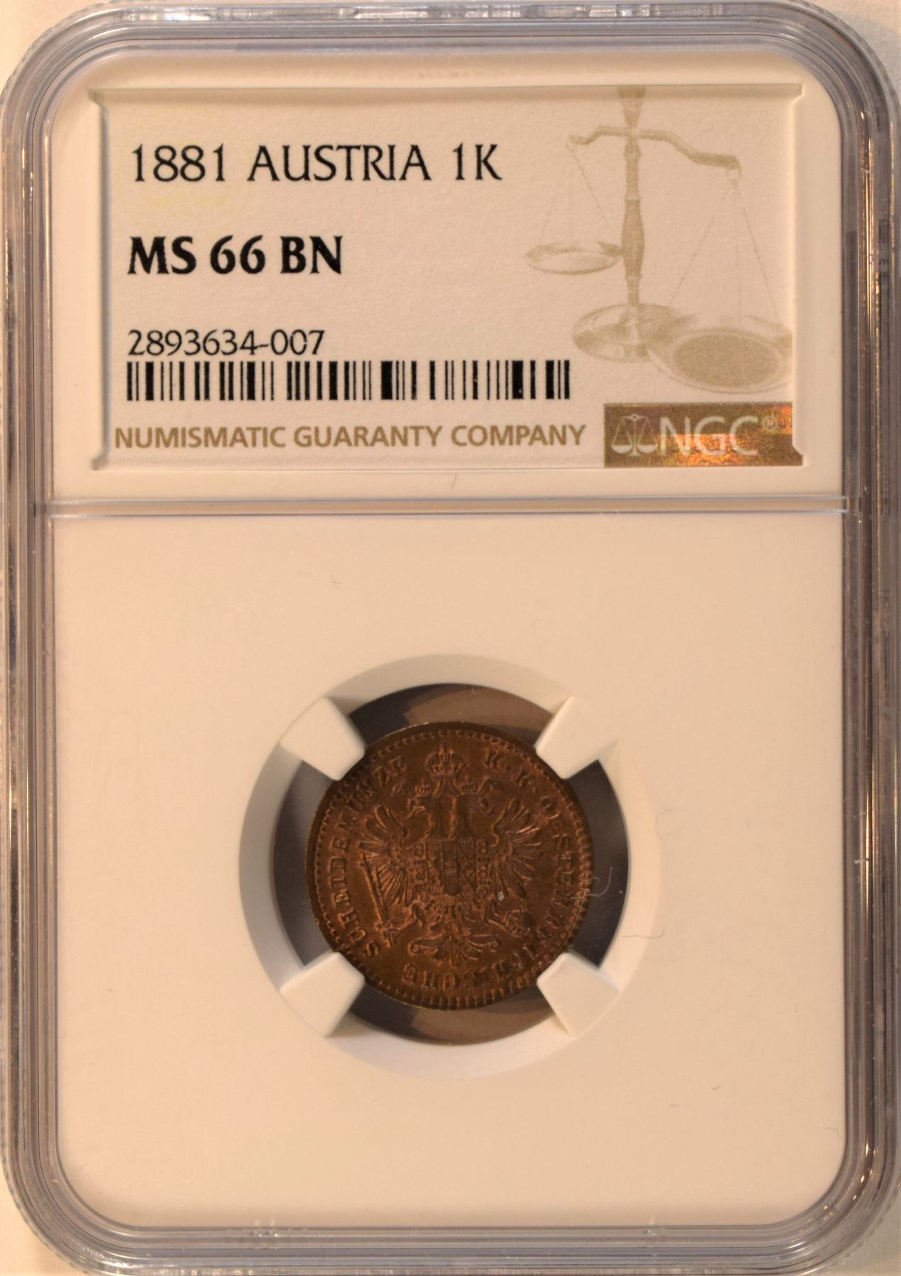 Austria, 1 Kreuzer 1881 Copper MS-66 NGC Certified Repunched * not reflected on level, "TOP POP" Only 4 and no Higher Graded