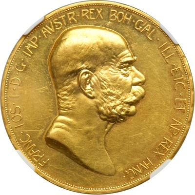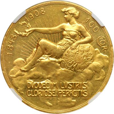 Austria. 100 Corona, 1908. Fr-514; KM-2812. Franz Josef, 1848-1916. Plain head right. Reverse: Female reclining on clouds. On the 60th year of reign. In a new 4 prong NGC holder. NGC graded AU-58.