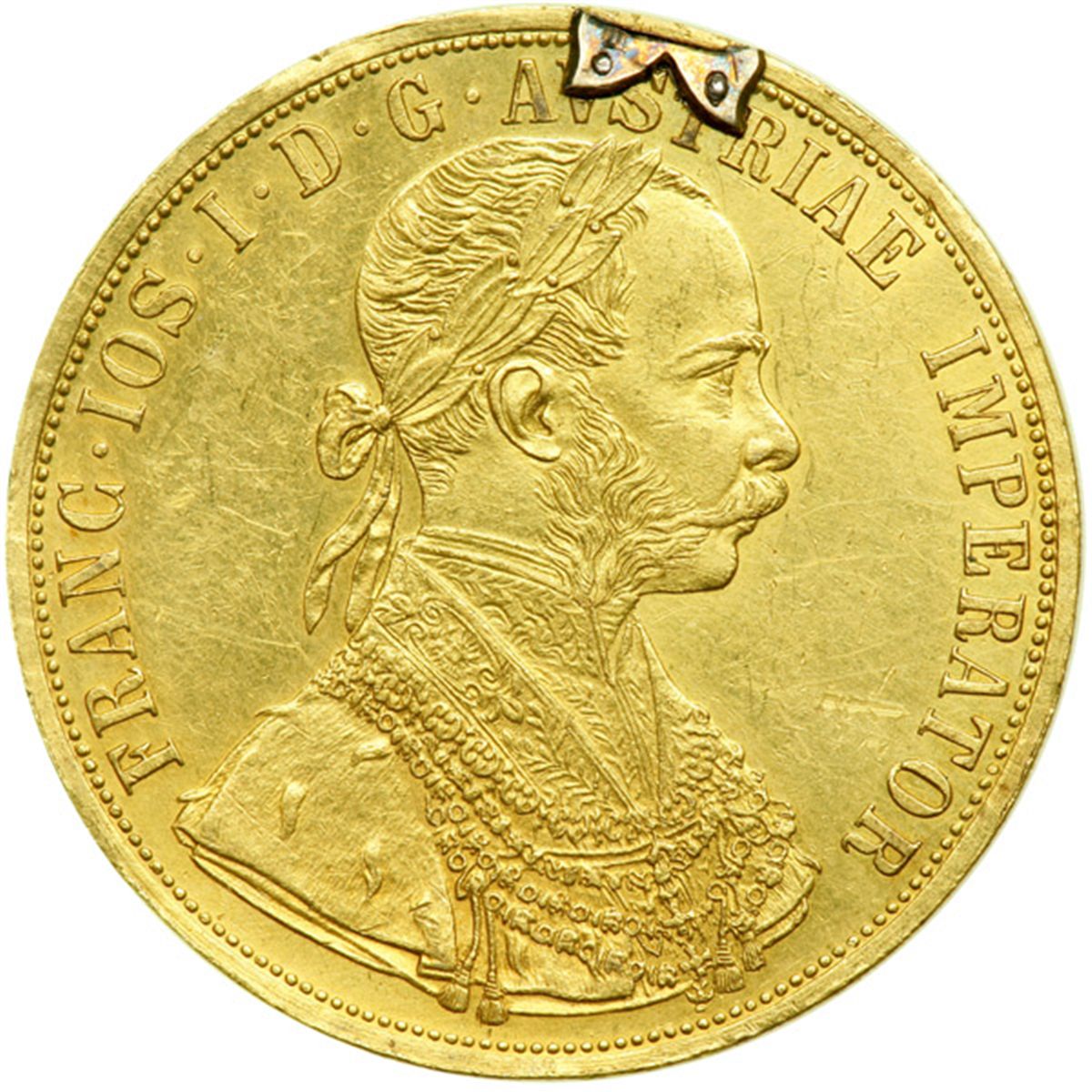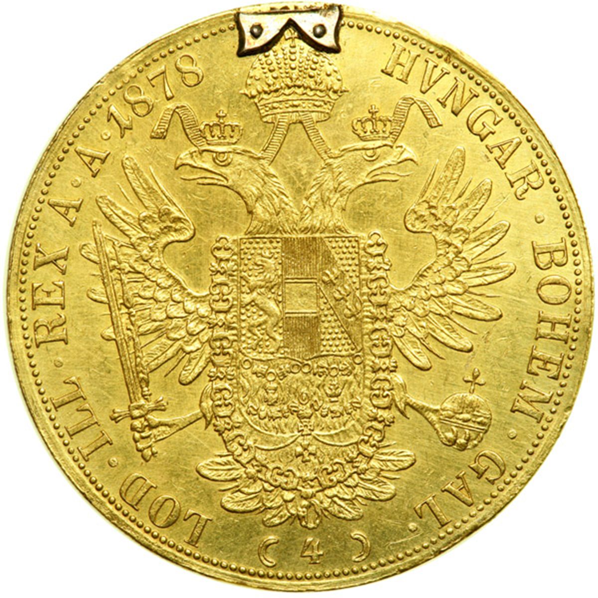 Austria. 4 Ducats, 1878. Fr-487; KM-2276. Weight 0.4426 ounce. Franz Joseph I. Mount mark. Very Fine.