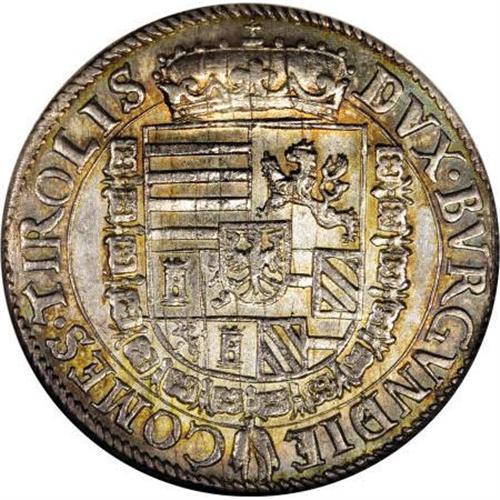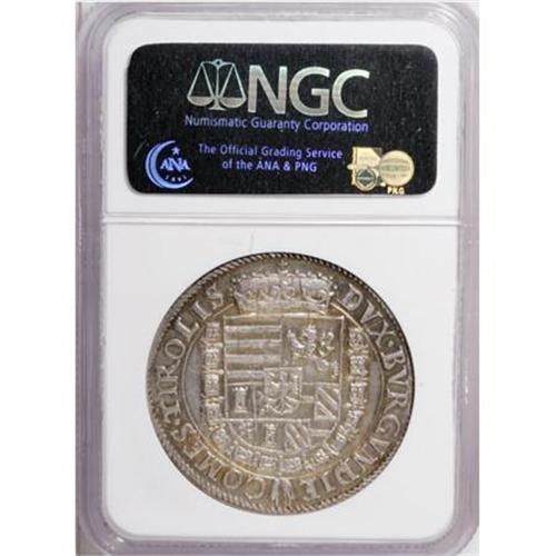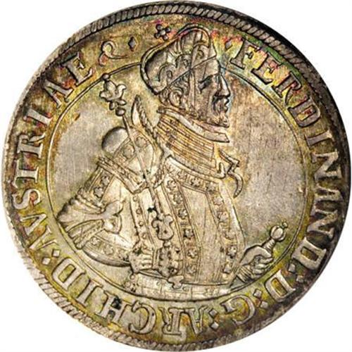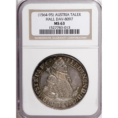 <B>Archduke Ferdinand Taler ND (1564-95) Hall,</B></I> D-8097, MS63 NGC. Fully lustrous with adjustment marks on both sides and attractive gold and blue peripheral toning.<BR><BR><b>Shipping:</b> Coins & Currency (<a target="_blank" href="http://www.heritageauctions.com/common/shipping.php">view shipping information</a>)