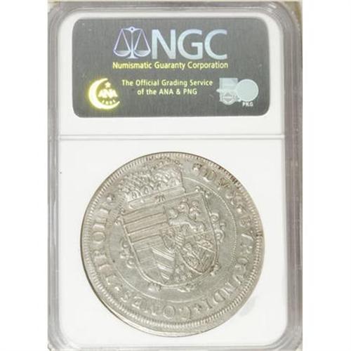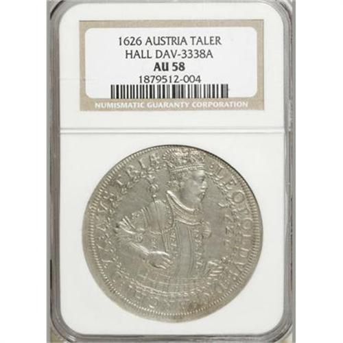 <B>Archduke Leopold Taler 1626, Hall mint,</B></I> D-3338, KM-629.2, AU58 NGC. Sharply struck with considerable remaining luster and no apparent flaws.<BR><BR><b>Shipping:</b> Coins & Currency (<a target="_blank" href="http://www.heritageauctions.com/common/shipping.php">view shipping information</a>)