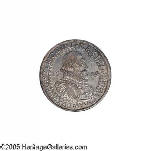 <B>Archduke Maximilian Taler 1614-Co Hall, </B></I>KM188.2, Davenport 3320, AU55 PCGS, bust divides the date, which is 1614/3, very scarce type, particularly in this choice quality.