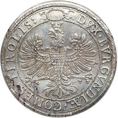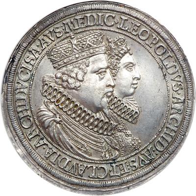 Austria. Double Taler, ND (1626) Hall. Dav-3331. Archduke Leopold As Count of Tyrol, 1626-1632. For the marriage of the Archduke to the Princess Claudia of Medici. Conjoined bust of the couple right. Reverse: Wreath over eagle. Sharply struck with considerable original luster and light gray toning. NGC graded AU-55.