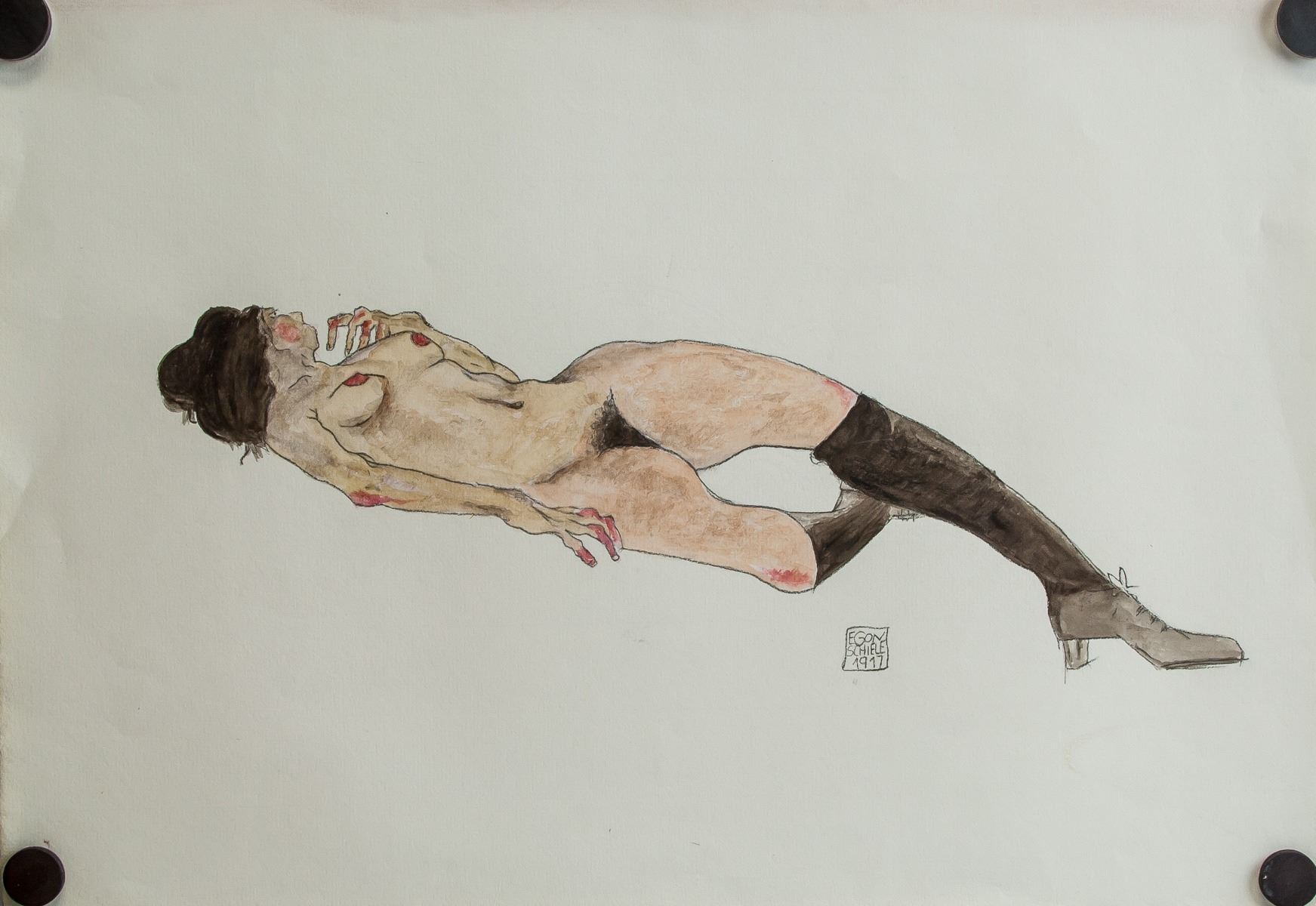 Mixed media on paper. Featuring a nude. Signed Egon Schiele and inscribed 1917 on the lower right quadrant. 30 x 43.5 cm (11.8 x 17.1 inches). PROVENANCE: Upper New York estate