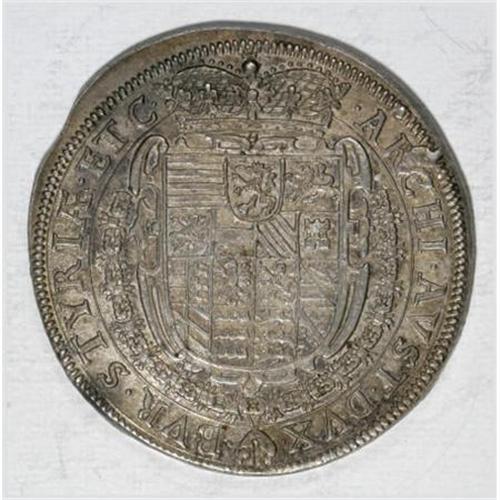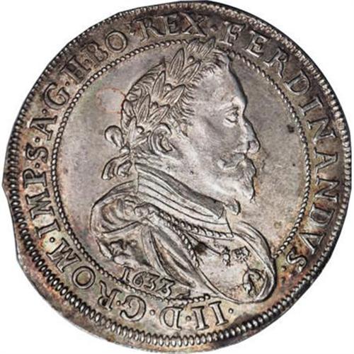 <B>Ferdinand II Taler 1633/2 Graz,</B></I> KM749.1, Davenport 3110, toned AU-UNC, bold features and virtually full underlying mint luster, one small planchet clip at 8 o'clock, as made. The overdate is clearly defined.<BR><BR><BR><b>Shipping:</b> Coins & Currency (<a target="_blank" href="http://www.heritageauctions.com/common/shipping.php">view shipping information</a>)